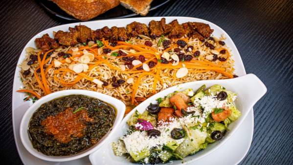 Rice, Salad, Humus, Tzatziki, Hot Sauce, Ground Beef