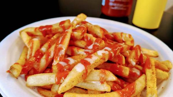 Tasty Seasoned Fries Served with Homemade Hot Sauce and Garlic Sauce.