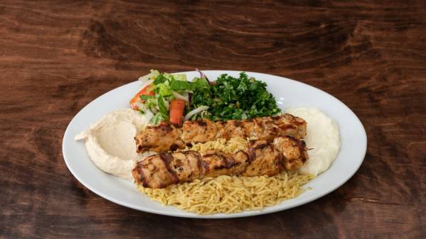 Two juicy grilled chicken skewers with fries or rice, two salads, hummus, garlic dips, and pita brea...More