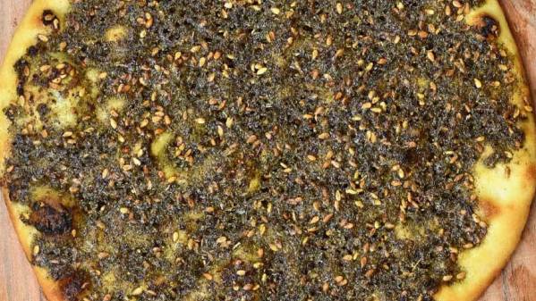 Thyme spice mixed with sesame seeds and olive oil spread on pita bread