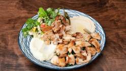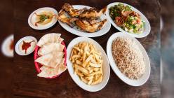 Grilled chicken breast fillet with homemade fries or rice, two salads, hummus, garlic dips, and pita...More