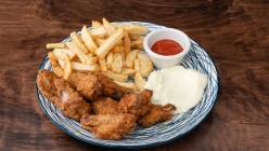 Five pieces of fried chicken nuggets with homemade fries or rice.