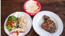 Grilled lamb steak with homemade fries or rice, two salads, hummus, garlic dips, and pita bread.