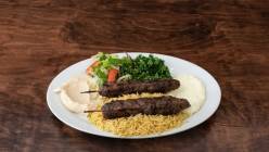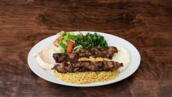 Two Juicy grilled beef kebabs skewers served with fries or rice, two salads, hummus, garlic dips, an...More