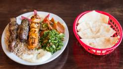 Assorted lamb, chicken, and beef skewers with fries or rice, salads, hummus, garlic dips, and pita b...More